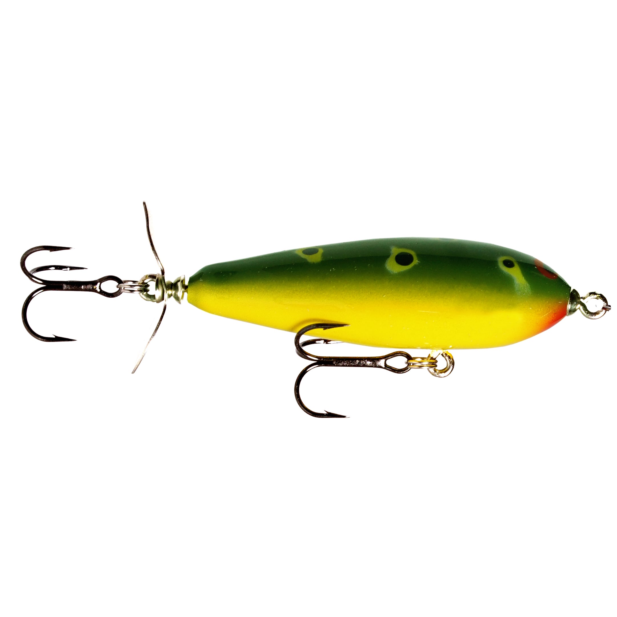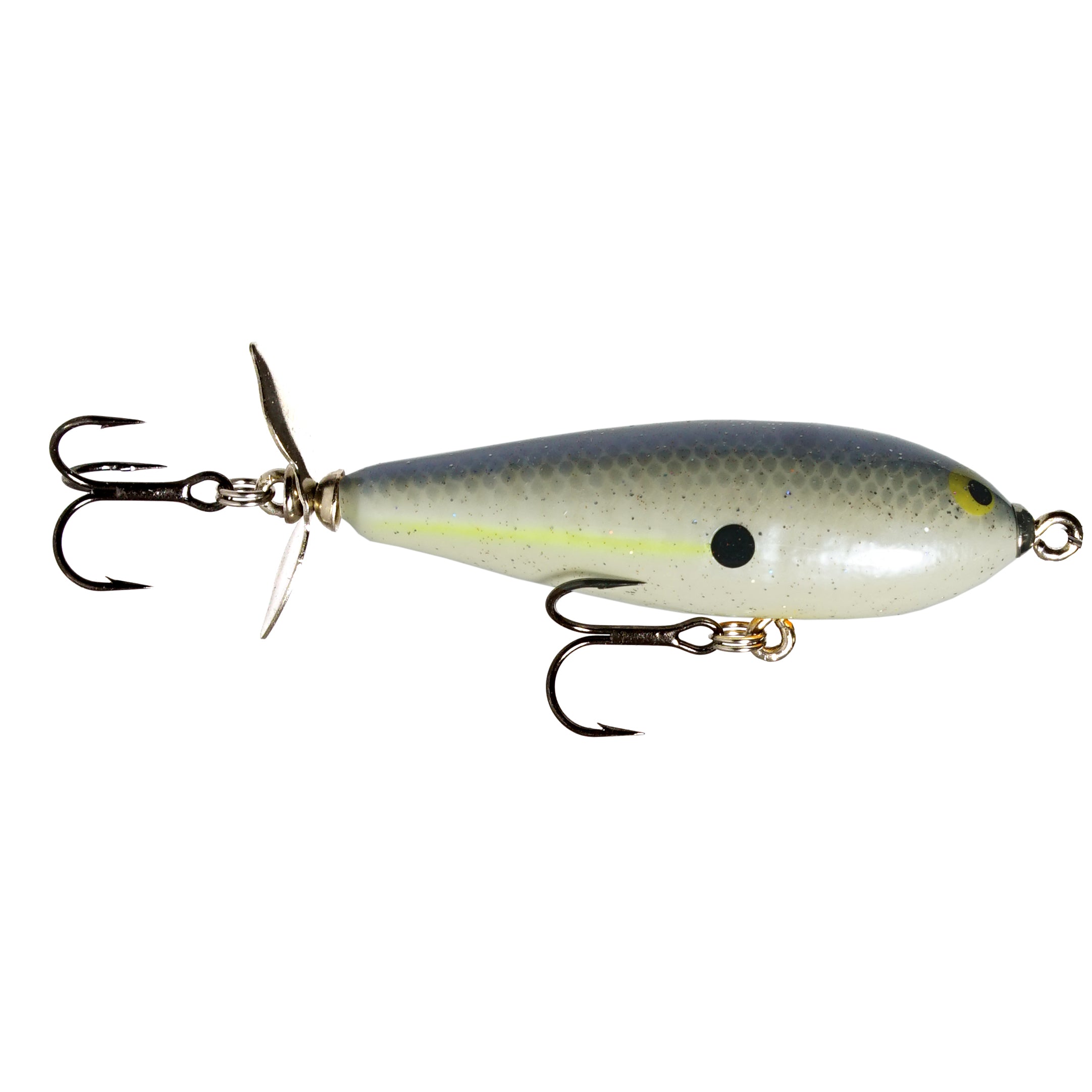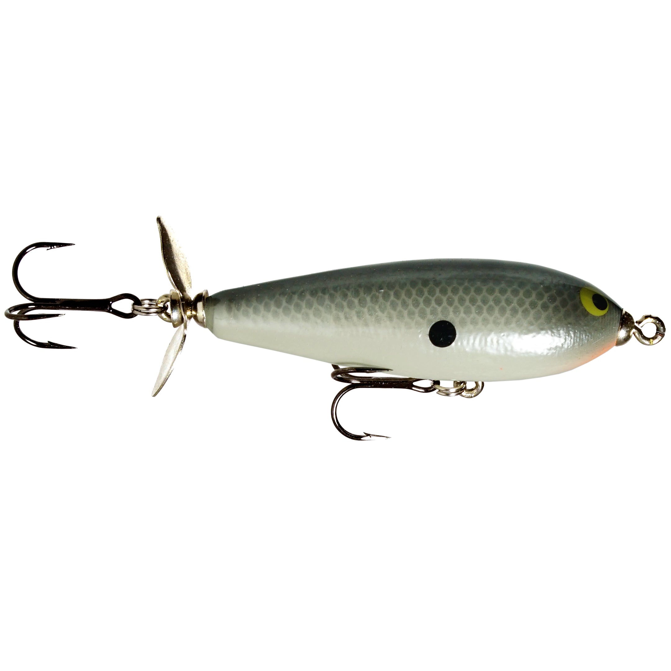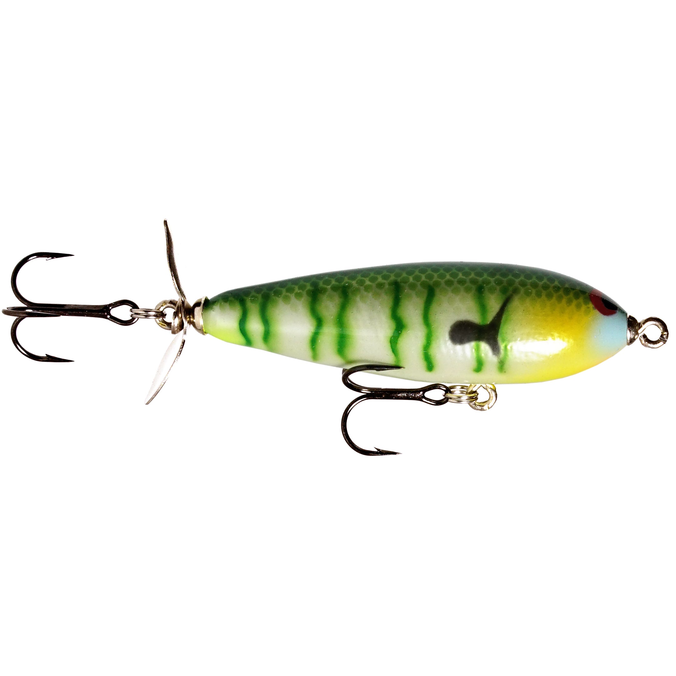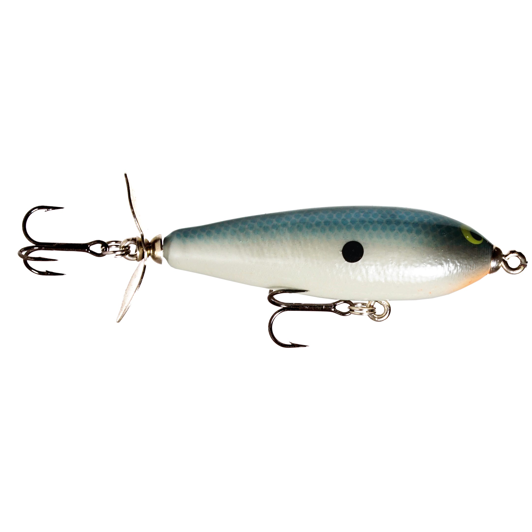 The Crippled P has that unmistakable churning action of a classic single rear prop bait. Match the forage with our beautiful hand painted patterns, this bait is an ideal imitation of a wounded baitfish sputtering across the surface. Bait sits tail down when not in motion causing that erratic action and side to side jumping motion when twitched. Bait has extremely good hook up ratio due to this design.